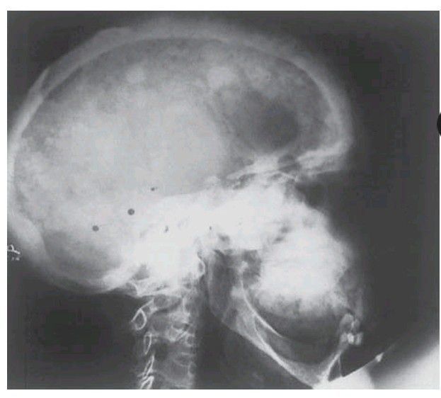Paget’s disease of the skull and maxilla. The thickening of the bone and the irregular areas of sclerosis and resorption, which give it a f l uffy appearance, are in striking contrast to the unaffected mandible.