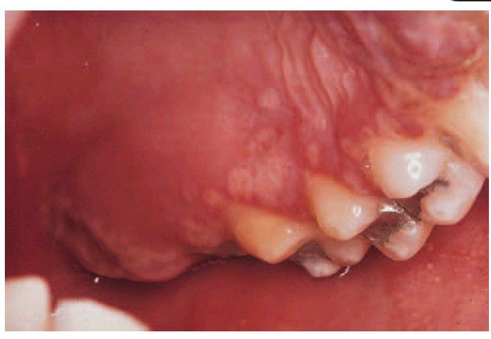A group of recently ruptured vesicles on the hard palate, a characteristic site. The individual lesions are of remarkably uniform size but several have coalesced to form larger irregular ulcers.