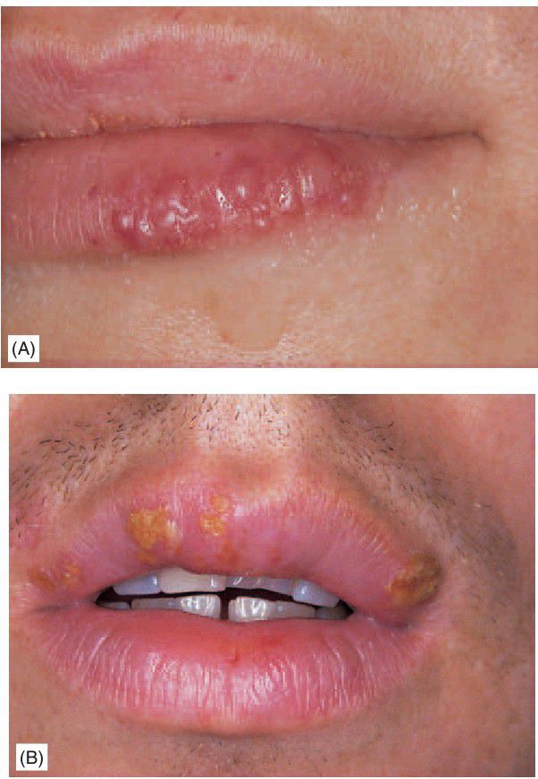 (A) Typical vesicles. (B) Crusted ulcers affecting the vermilion borders of the lips.