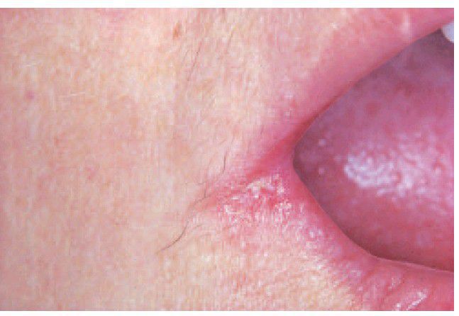 . Cracking and erythema at the commissure is due to leakage of saliva containing C. albicans, constantly reinfecting the lesion.