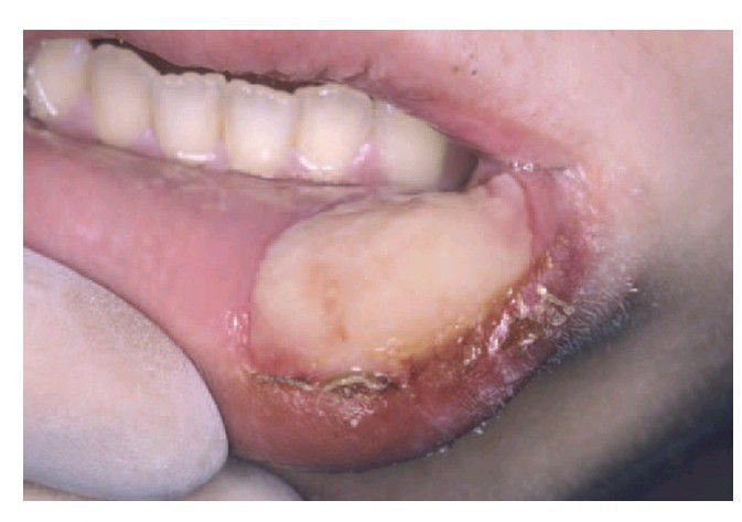 A large traumatic ulcer on the lower lip. Note the colour of the f i brin slough, distinct from the keratin of a white patch, and the welldefi ned epithelial margin with minimal infl ammation.