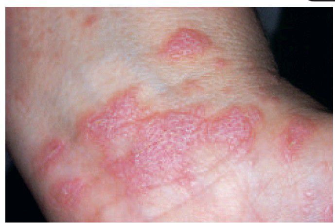 This, the fl exor surface of the wrists, is a characteristic site. The lesions consist of confl uent papules with a pattern of minute white striae on their surface.