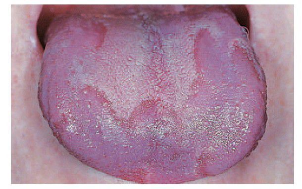 Erythema migrans. Typical appearance with irregular depapillated patches centred on the lateral border of the tongue. Each patch has a narrow red and white rim.