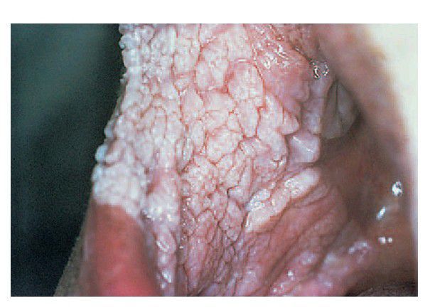 . An extensive lesion covering most of the buccal mucosa and starting to involve the skin at the commissure. Such longstanding lesions are likely to develop invasive squamous carcinoma and may then metastasise. By kind permission of Professor SJ Challacombe.