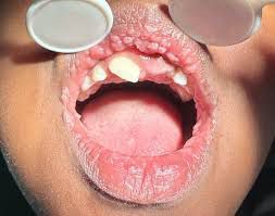 Heck's disease, also known as focal epithelial hyperplasia (FEH), is a benign, viral-induced condition of the oral mucosa. It's characterized by the development of multiple, soft, and painless papules or nodules in the mouth, primarily affecting the lips, cheeks, and tongue. The condition is caused by human papillomavirus (HPV), with types 13 and 32 being the most commonly identified.