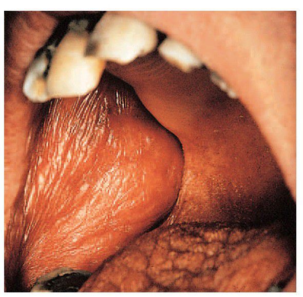 The mucosa is dry, red, atrophic and wrinkled and sticks to the fi ngers or mirror during examination. These changes are common to all causes of xerostomia.