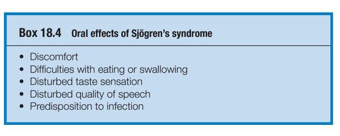 Major oral effects of Sjögren’s syndrome are summarised in Box 18.4.