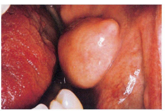 Lipoma of the cheek. The tumour forms a pale, very soft yellowish swelling.