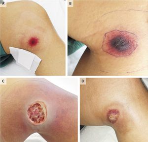 A 21-year-old woman with acute myeloid leukemia who was undergoing induction chemotherapy presented with a lesion on her left knee that had developed 5 days after initiation of therapy. A physical examination revealed a 2-cm hemorrhagic patch with an erythematous border (Panel A). The patient was afebrile, and other than the lesion, the findings from physical examination were unremarkable. Laboratory findings were notable for pancytopenia, including an absolute neutrophil count of 490 cells per cubic millimeter (normal range, 950 to 5450). The lesion progressed rapidly into a violaceous pustule (Panel B), and fever (temperature of 39.5°C) subsequently developed in the patient. A punch biopsy of the lesion was performed, and the specimen showed perivascular hemorrhage and infiltration of neutrophilic granulocytes with central necrosis. Blood and wound cultures grew Pseudomonas aeruginosa, and a diagnosis of ecthyma gangrenosum was made. Ecthyma gangrenosum is a cutaneous infection associated with P. aeruginosa bacteremia. The infection typically occurs in immunocompromised or critically ill patients and warrants prompt diagnosis and treatment. The patient was treated with ceftazidime and gentamicin, administered intravenously. Because deep infection was suspected, she underwent surgical débridement (Panel C). As the patient recovered from the aplastic phase, the wound healed substantially (Panel D shows the wound approximately 3 months after the initiation of induction chemotherapy). The patient did not have a complete remission of acute myeloid leukemia, and she subsequently underwent allogeneic stem-cell transplantation. Anna K.M. Korte, M.D. Josephine M. Vos, M.D. Sint Antonius Ziekenhuis, Nieuwegein, the Netherlands