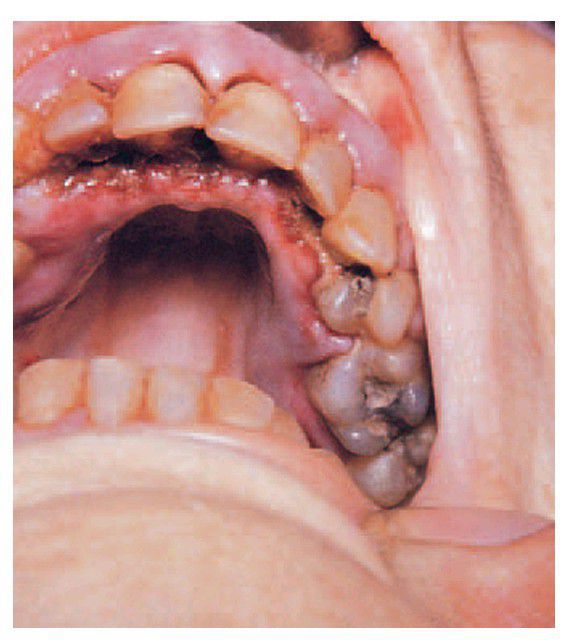 The gingivae are grossly swollen and purplish; in addition there is ulceration along the palatal aspect of the anterior teeth resulting from the increased susceptibility to infection.