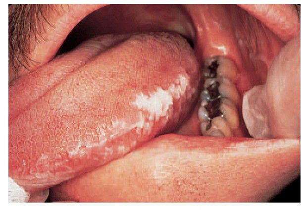 The characteristic appearance on the lateral margin of the tongue. Posteriorly, the vertical ridging pattern of the lateral tongue is enhanced. (By kind permission of Professor WH Binnie.)