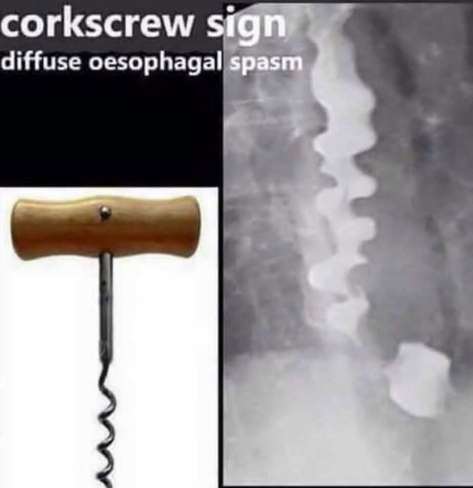 The term "corkscrew sign" refers to a specific radiographic appearance associated with two distinct medical conditions: midgut volvulus and diffuse esophageal spasm. In midgut volvulus, it describes the twisted, spiral configuration of the distal duodenum and proximal jejunum. In diffuse esophageal spasm, it represents the corkscrew or rosary bead-like appearance of the esophagus due to abnormal contractions.