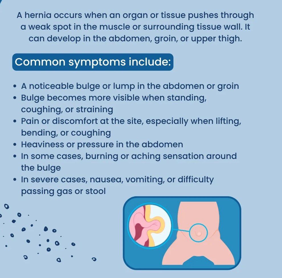 A hernia occurs when an organ or tissue pushes through a weak spot in the surrounding muscle or tissue, most commonly in the abdomen. Inguinal hernias, which occur in the groin area, are the most common type. Symptoms can include a visible bulge, pain, or a feeling of pressure or aching.