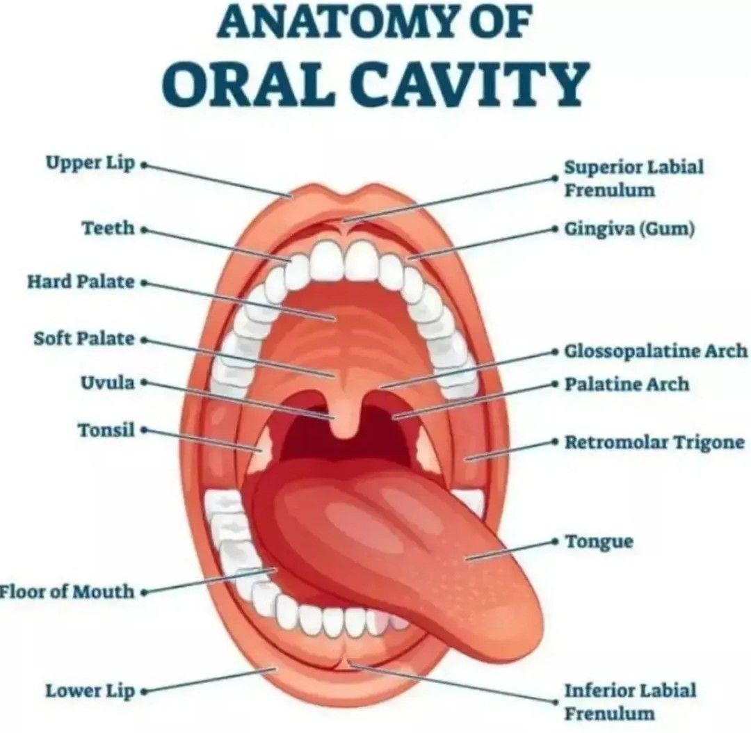 The oral cavity, or mouth, is the initial part of the digestive system and also plays a role in respiration and speech. It includes the lips, teeth, gums, tongue, hard and soft palate, and the floor of the mouth. The oral cavity is divided into the vestibule (the space between the cheeks/lips and teeth/gums) and the oral cavity proper (the area behind the teeth and gums).