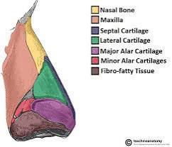 The external nose's bony framework is composed of the nasal bones, the frontal processes of the maxillae, and the nasal part of the frontal bone. These bones form the upper one-third of the nose's structure. The lower two-thirds are made up of cartilage, including the lateral nasal cartilages, major alar cartilage, and septal cartilage. Here's a more detailed breakdown: Nasal Bones: These are two small, oblong bones that articulate with each other in the midline to form the bridge of the nose. Frontal Processes of Maxillae: These are extensions of the maxillary bones that contribute to the sides of the nose and connect with the nasal bones. Nasal Part of Frontal Bone: This forms the superior part of the nose, where it connects with the frontal bone of the skull. Cartilages: The cartilaginous part of the nose is made up of several cartilages that give the nose its shape and flexibility. The major cartilages include the lateral nasal cartilages, major alar cartilages, and septal cartilage, which form the lower two-thirds of the nose.