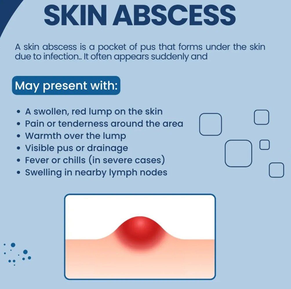 A skin abscess is a bump within or below the skin's surface. It is usually full of pus, painful, and may feel thick and swollen.