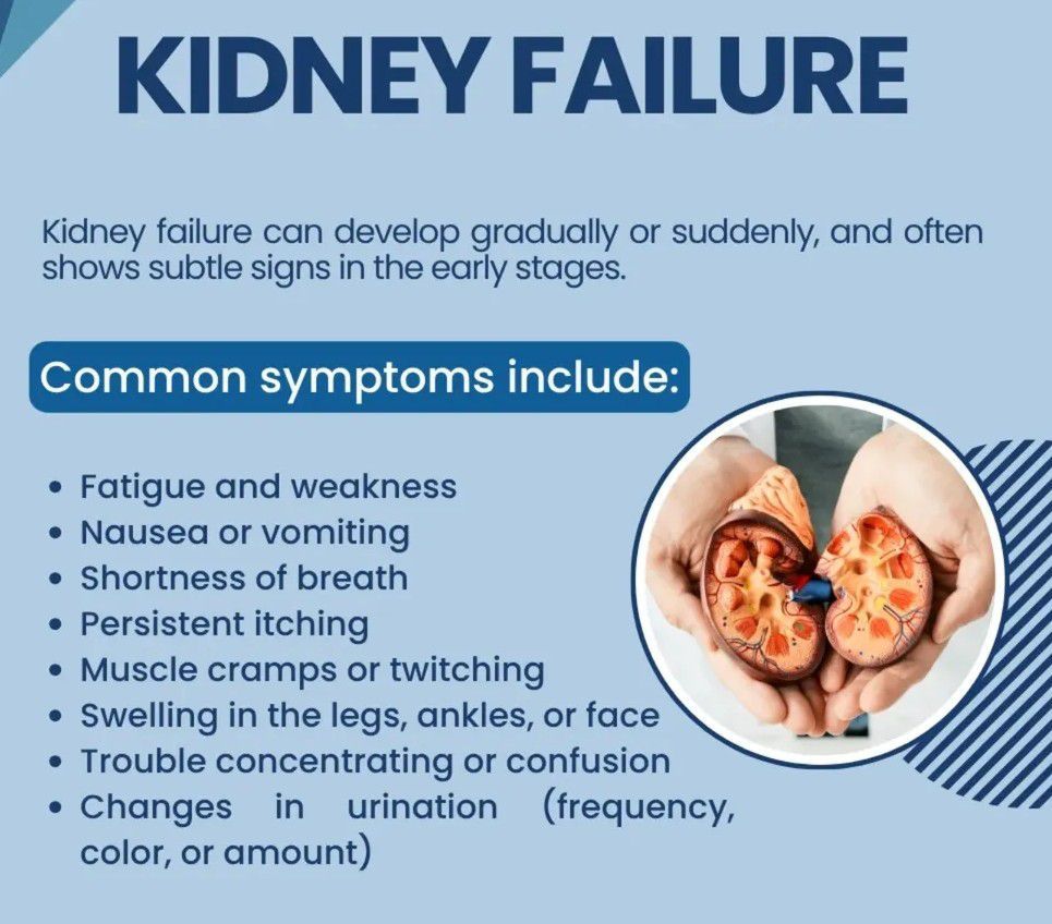 Kidney failure, also known as renal failure or end-stage renal disease, is a medical condition in which the kidneys can no longer adequately filter waste products from the blood, functioning at less than 15% of normal levels.