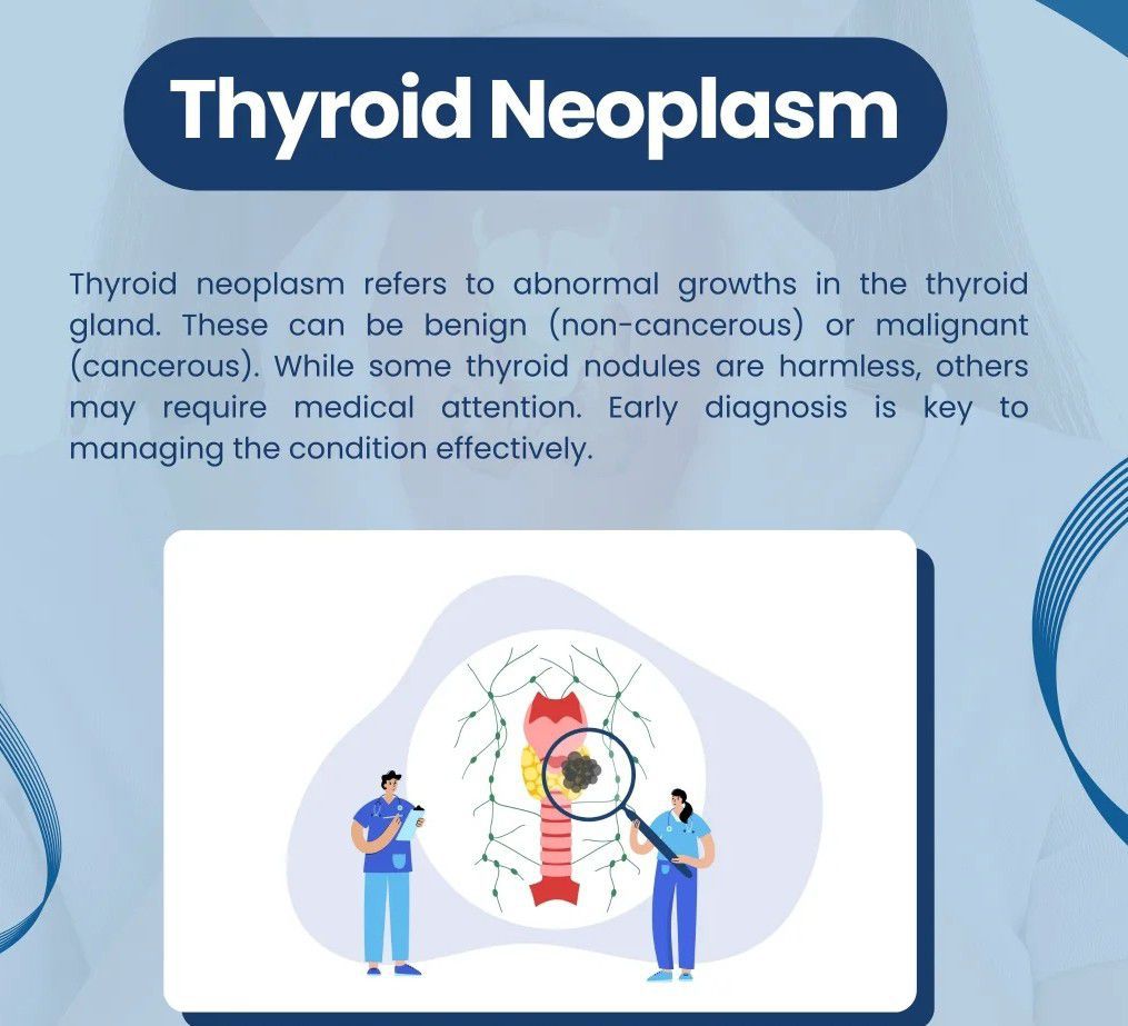 A thyroid neoplasm is a tumor of the thyroid gland, which can be either benign (non-cancerous) or malignant (cancerous). These tumors can range from benign thyroid adenomas to malignant carcinomas like papillary, follicular, medullary, or anaplastic thyroid cancer. While most thyroid nodules are benign, it's crucial to identify and manage those that are malignant.