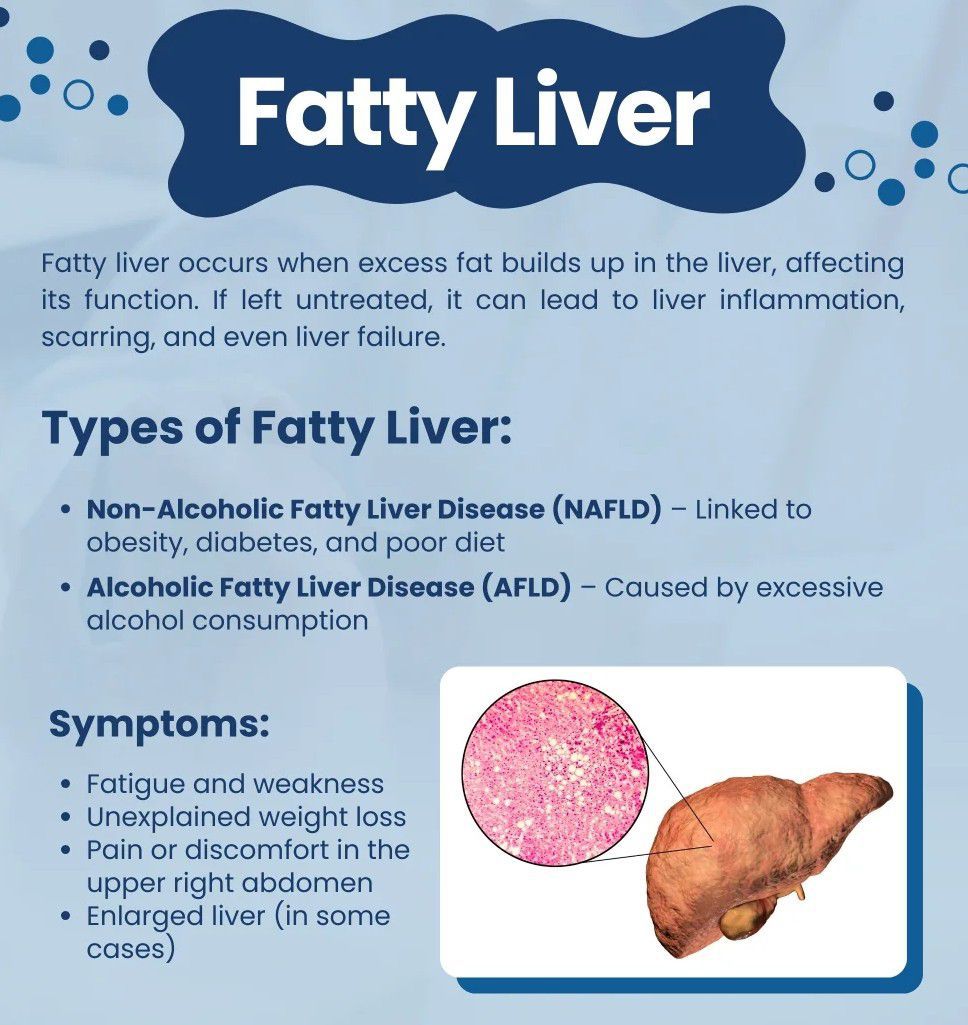 Fatty liver disease, also known as hepatic steatosis and steatotic liver disease, is a condition where excess fat builds up in the liver. Often there are no or few symptoms. Occasionally there may be tiredness or pain in the upper right side of the abdomen.