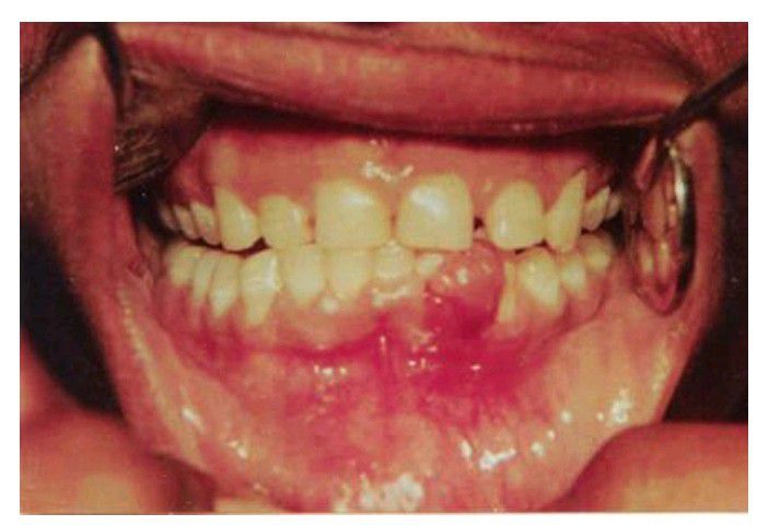 Inflammatory hyperplasia present on lower gingiva