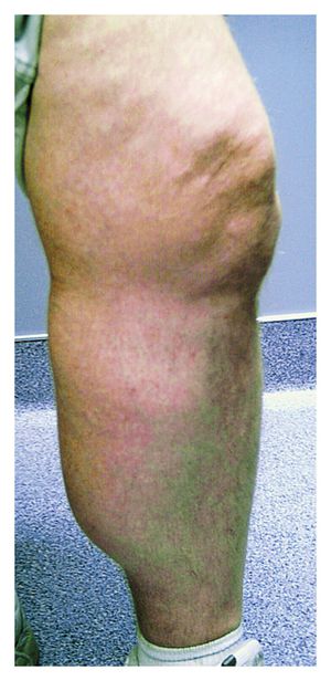 A ruptured baker's cyst which is a complication of RA