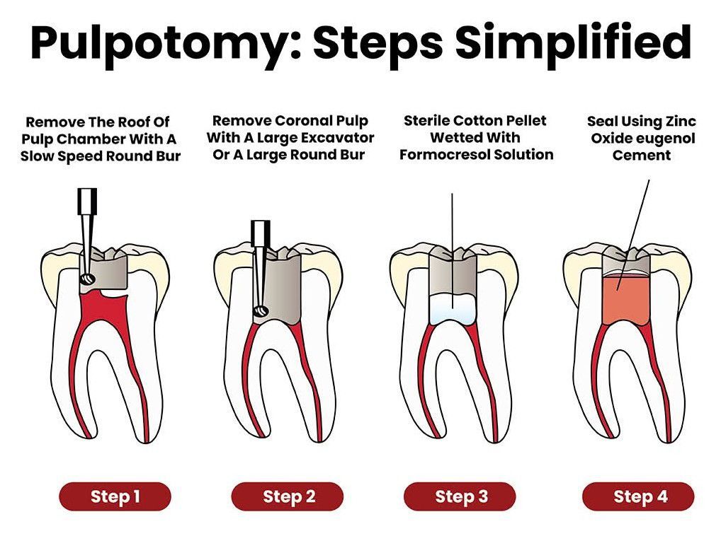 A pulpotomy is a dental procedure to remove decayed or inflamed pulp from the crown of a tooth, preserving the healthy pulp in the roots. This minimally invasive treatment is commonly performed on children's primary teeth with deep decay but no root pathology, aiming to maintain tooth vitality and facilitate proper permanent tooth eruption. The procedure involves numbing the tooth, removing the infected pulp, applying a medicated material, and restoring the tooth with a filling or crown to seal the space.