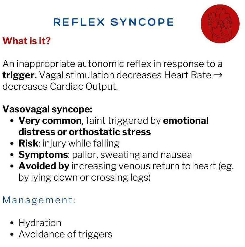 Reflex syncope is a brief loss of consciousness due to a neurologically induced drop in blood pressure and/or a decrease in heart rate. Before an affected person passes out, there may be sweating, a decreased ability to see, or ringing in the ears. Occasionally, the person may twitch while unconscious.