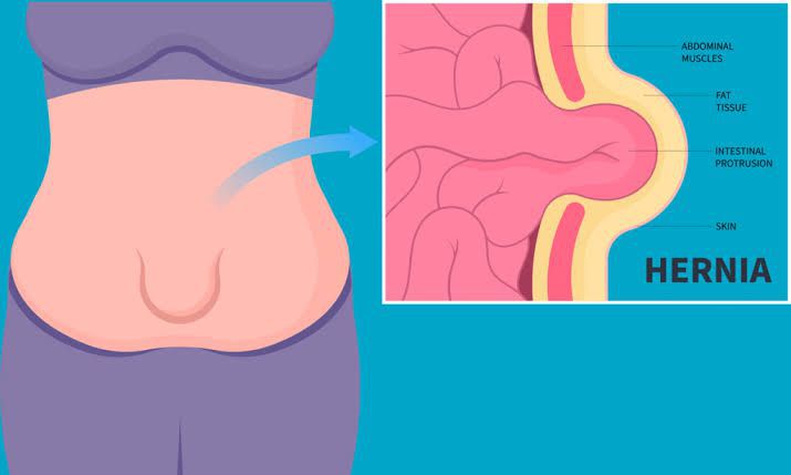 An umbilical hernia is a health condition where the abdominal wall behind the navel is damaged. It may cause the navel to bulge outwards—the bulge consisting of abdominal fat from the greater omentum or occasionally parts of the small intestine