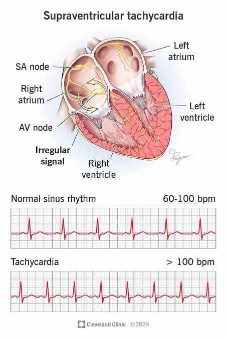 Supraventricular tachycardia is an umbrella term for fast heart rhythms arising from the upper part of the heart. This is in contrast to the other group of fast heart rhythms – ventricular tachycardia, which starts within the lower chambers of the heart.