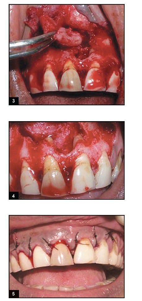Bony window widened and cystic lesion enucleation is being carried out. (4) All the apices of three anterior teeth involved in the lesion are exposed for apicoectomy procedure. (Root canal filling is done prior to surgery). (5) Suturing