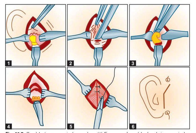 Condylectomy—surgical procedure: (1) Exposure of condylar head via preauricular incision, (2) Sectioning of condylar head, (3) Breaking the fibrous adhesions, (4) Condylectomy complete, (5) Suturing the capsule, (6) Final skin suturing