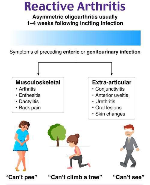 Reactive arthritis symptoms include joint pain and swelling, particularly in the knees and ankles, which can also cause back and heel pain. Other common symptoms include eye inflammation (conjunctivitis), urinary issues like pain or burning during urination, and skin problems such as a scaly rash on the palms or soles. Some people may also experience fatigue or mouth ulcers.