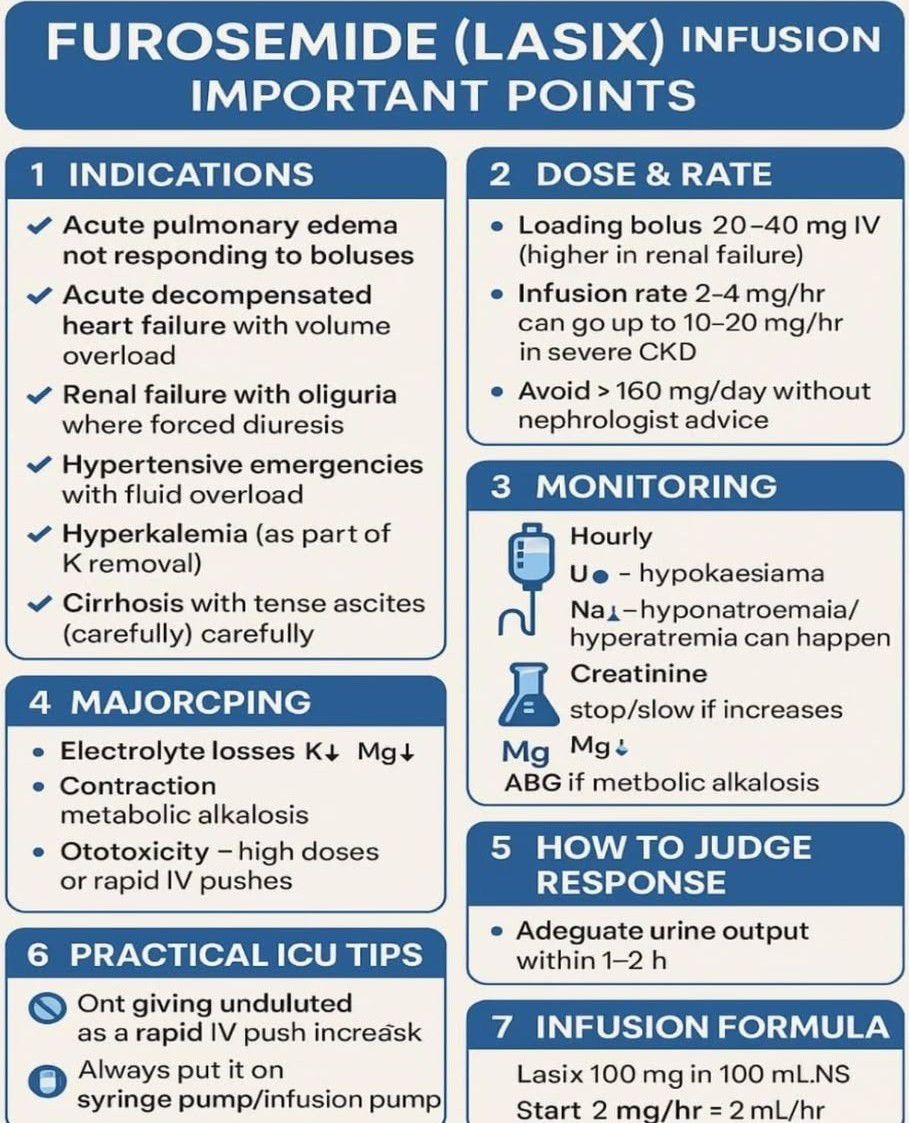 A furosemide infusion is a method of administering high doses of the diuretic furosemide intravenously over a period of time to treat conditions like fluid overload from heart or kidney failure. It can be a continuous infusion or given as a slower, intermittent infusion, often used when oral administration is not possible or when a stronger diuretic effect is needed to remove excess fluid. The exact dosage is individualized based on the patient's response.