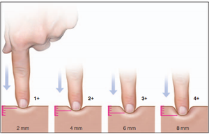 Pitting edema is graded on a scale from 1 to 4, which is based on both the depth the "pit" leaves and how long the pit remains. A patient with a score of 1 has edema that is slight (roughly 2mm in depth) and disappears rapidly. A score of 2 is deeper (4mm) and disappears within 15 seconds. A score of 3 is deeper yet (6mm), and can last longer than a minute; in stage 3 pitting edema the extremity also looks grossly swollen. Finally, stage 4 is the most severe with deep pitting (8mm or greater in depth) that may last more than 2 minutes Causes Pitting edema is most commonly seen in patients with heart, liver, or kidney failure. These three conditions cause the body to hold onto excess sodium and water. It can also be seen in patient's with rheumatological diseases such as rheumatoid arthritisand systemic lupus erythematosus. Pitting edema can also be seen in patients receiving excess intravenous fluids. Regardless of the cause, the excess fluid leaks out of the capillaries and into the surrounding tissues. When it leaks into the subcutaneous tissues it is seen clinically as pitting edema. It is important to note that if pitting edema is present, the patient may also be "leaking" fluid into the lung's airspaces and abdominal cavity. If significant lung edema is present a patient may experience shortness of breath, and potentially respiratory failure. If edema is present in the abdominal cavity (aka: peritoneal cavity) it is known as ascites.