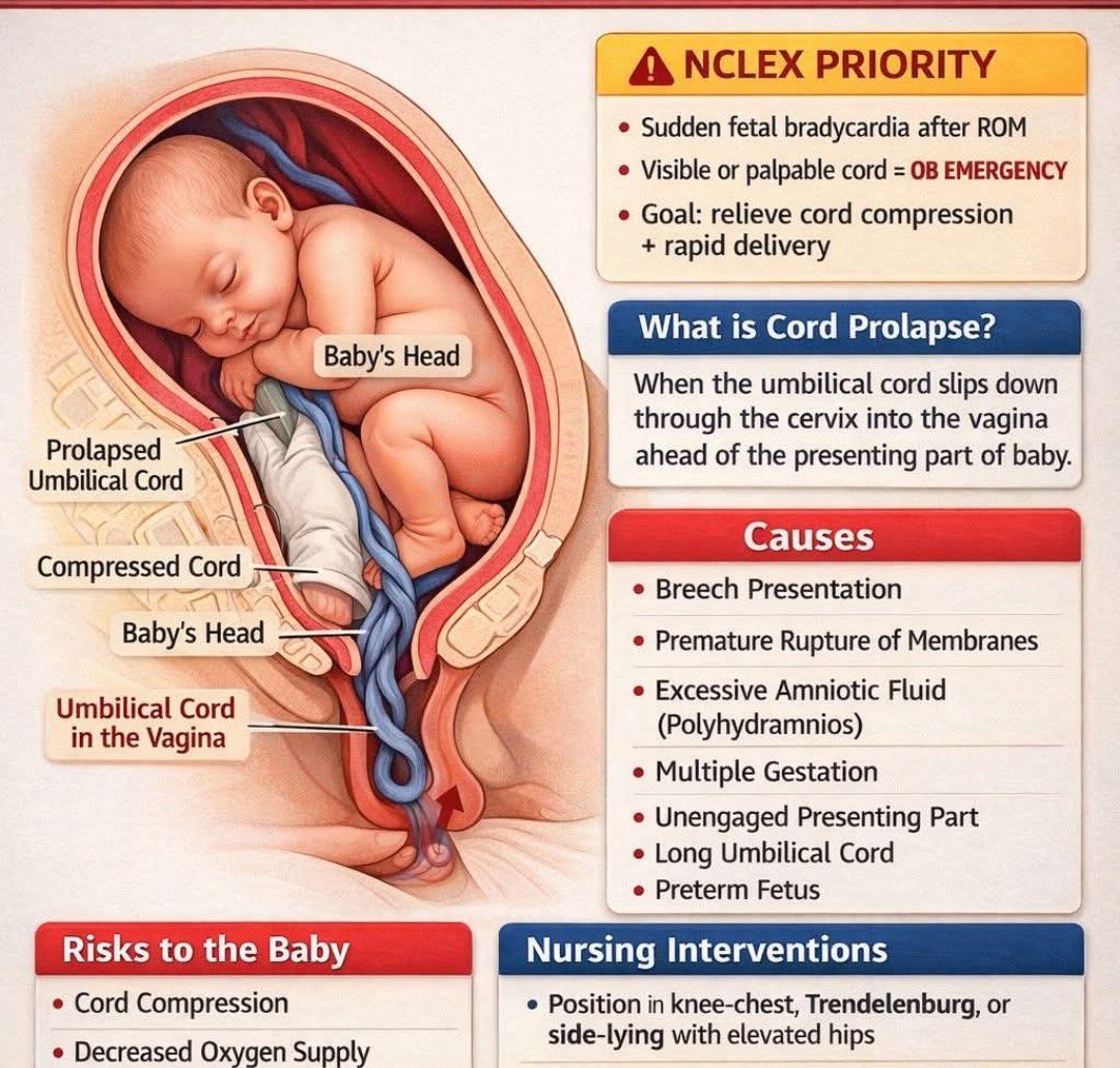 Umbilical cord prolapse is a rare, life-threatening obstetric emergency occurring when the cord drops through the cervix into the vagina ahead of the baby after membranes rupture, causing compression and restricted fetal oxygen. It requires immediate emergency delivery, usually via Cesarean section, to prevent fatal hypoxia.