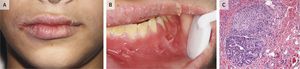 A 13-year-old boy presented with a 9-month history of episodic unilateral swelling of the face and oral pain. He reported having loose, nonbloody stools. Physical examination revealed asymmetric swelling of the face and lips with perpendicular fissuring (Panel A), and intraoral examination revealed discrete gingival erythematous hyperplasia and epulis fissuratumβlike soft-tissue tags in the mucobuccal fold (Panel B). Granulomatous inflammation consistent with Crohnβs disease was found on histopathological examination (Panel C), and the patient was referred to a pediatric gastroenterologist. He was found to have tenderness to palpation in the right lower quadrant and periumbilical region, a rectal fissure, and painless rectal skin tags. Colonic biopsies showed chronic active colitis that was most prominent in the cecum and ascending colon, which confirmed a diagnosis of Crohnβs disease. Therapy with mesalamine and prednisone was initiated and slowly tapered. Maintenance of remission was achieved with mercaptopurine. The oral lesions slowly resolved over a 1-year period. At a follow-up visit 2 years after the initial presentation, the patient remained asymptomatic.