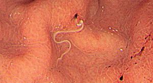 A 40-year-old man presented with abdominal pain after eating sushi. A diagnosis of anisakiasis was made based on this finding at gastroscopy. How many hours after ingestion do the symptoms of gastric anisakiasis typically occur? A) 1–12 h B) 12–24 h C) 24–36 h D) 36–48 h