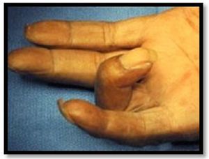 1.tenosynovitis flexion 2.swan neck 3.telescoping digit