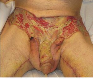 I work in a critical care recovery hospital (used to be called LTACH) and we have had about a dozen of these patients in my two years there. This one is actually one of the best case-scenarios of it. It looks as though they were able to save not only the shaft but the scrotum, too. Long healing time for sure!
