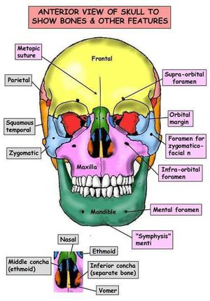 The human head is an anatomical unit that consists of the skull, hyoid bone and cervical vertebrae. The term "skull" collectively denotes the mandible (lower jaw bone) and the cranium (upper portion of the skull that houses the brain). The skull can also be described as being composed of the cranium, which encloses the cranial cavity, and the facial skeleton (includes the mandible). There are eight bones in the cranium and fourteen in the facial skeleton.