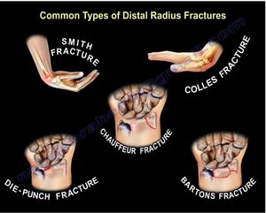 based on the Injury mechanism. Fr. Smith: supine hand position/hand inward, volar displaced Vs Fr. Colles: Pronated/hand outward, dorsal displaced