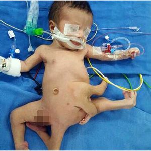 This is a rare case of polymelia in a 7-month-old male child who presented with developed lower limbs and an additional several underdeveloped left lower limbs. Polymelia is a birth defect which involved in forming and duplication of incomplete extra parts of the body that usually impact on deformed and shrunken limbs. The extra limbs came from supposedly twins, conjoined twins and are commonly deformed. This happens when embryo starts as conjoined twins but didn’t continue to develop. The accessory limbs are attached to various body regions and could be classified as cephalomelia (extra-limb attached to the head), notomelia (limb attached to the back bone), thoracomelia (attached to thorax), and pyromelia (attached to pelvis). These anomalies are usually associated with genetic factors including tamogenes, chromosomes, and environmental agents. Treatment for such a case like ours requires surgery to detach the soft tissue between false limb and the true pelvic region.