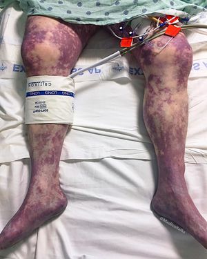 He was found down in a halfway house with altered mental status. Purpura fulminans is due to a rare, rapidly progressive, and often fatal syndrome of intravascular thrombosis and hemorrhagic infarction of the skin that is rapidly progressive and is accompanied by dermal vascular collapse and disseminated intravascular coagulation. It manifests as blood spots, bruising, and discoloration of the skin. It may occur in individuals with dysfunction of the protein C anticoagulant system, with acute severe infection, or idiopathically without any coagulation dysfunction or infection. Purpuric lesions were seen over many different skin sites, including the perineal region, the flexor surface of the thighs, and abdominal skin Skin lesions soon enlarge and become vesiculated, producing hemorrhagic bullae with subsequent necrosis and black eschar formation, as well as septic shock in severe cases. Purpura fulminans from sepsis requires surgical debridement, skin grafting and even amputation. Photo by @doctordiaries