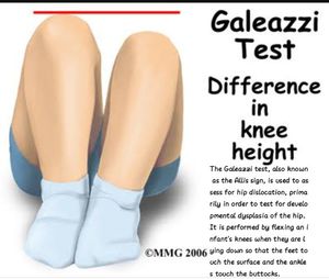 Galeazzi Test, also called Allis Test or Allis Sign, is a significant part of the hip examination. This test is performed when developmental hip dysplasia or hip dislocation is suspected. In this pediatric test, the infant is in supine position.. The knees and hips are flexed such that the ankles touch the buttocks and feet touch the surface. Now the knee caps of the child are checked. If they are equal with respect to a straight horizontal line then the test is negative and indicates no abnormality. However, in the positive Galeazzi Test, the knees are not equal the child is diagnosed with congenital hip dysplasia.