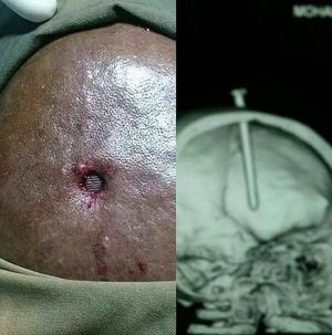 ⚠️ Case of a patient who inserted a nail in his head after suffering from severe case of migraine in hope to relieve the extreme pain. The patient apparently had a history of psychiatric disorders and was fortunate enough to survive the injury. As in closed head injury, intracranial pressure is likely to increase due to swelling or bleeding, potentially crushing delicate brain tissue. Most deaths from penetrating trauma are caused by damage to blood vessels, which can lead to intracranial hematomas and ischemia, which can in turn lead to a biochemical cascade called the ischemic cascade. A person with a penetrating head injury may be evaluated using X-ray, CT scan, or MRI (MRI can only be used when the penetrating object would not be magnetic, because MRI uses magnetism and could move the object, causing further injury). Surgery may be required to debride or repair the injury or to relieve excessive intracranial pressure.
