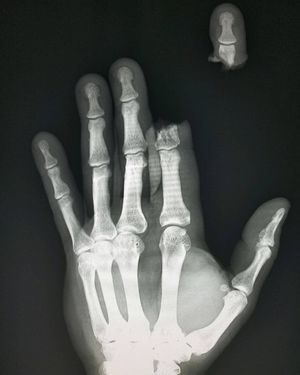 Hand x-ray showing severed finger caused by a chainsaw accident