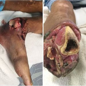 This history on this case is that the patient presented with an injury and was told not to use that foot or to put weight on it. He is a patient with uncontrolled diabetes. He did not listen to the doctor and continued to used the injured foot. It never healed properly and his ankle just literally exploded open as seen in the first photo. He then had to have the foot amputated as seen in the second photo. This guy is in trouble. If you look around the site where his foot was cut off you can see it kinda looks nasty along the one edge on the left. It's a little brownish greenish. That is an area of dead tissue. That means he will require further surgeries. The damage to his blood vessels from his diabetes is so bad it is not allowing oxygen rich blood to get to the wound to allow proper healing. This is why diabetes is no joke.