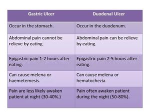 Diff between gastric and duodenal ulcers