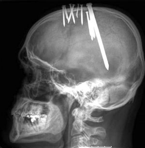 A 44 year old man was referred to the accident and emergency department by the psychiatric services, having claimed to have hammered several nails through