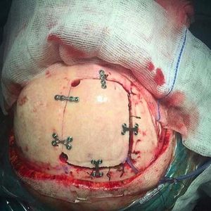 Cranioplasty is a reconstructive surgical intervention to repair cranial defects. This picture shows a skull fixation following careful surgical opening of the skull, or craniotomy. The piece of bone is temporarily lifted to allow access to the brain for surgery. After the brain surgery is performed, the piece of bone replaced and stapled back together using fixation screws, and other techniques. The bone will eventually re-grow and the skull will be fully continuous again.